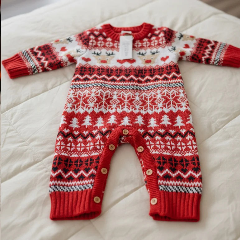 Crafted in a soft, knitted design featuring charming Christmas patterns of reindeer, trees, and snowflakes, this sleep-suit wraps your baby in warmth and festive cheer. Perfect for cozy nights by the tree or lazy winter mornings filled with giggles and cuddles.