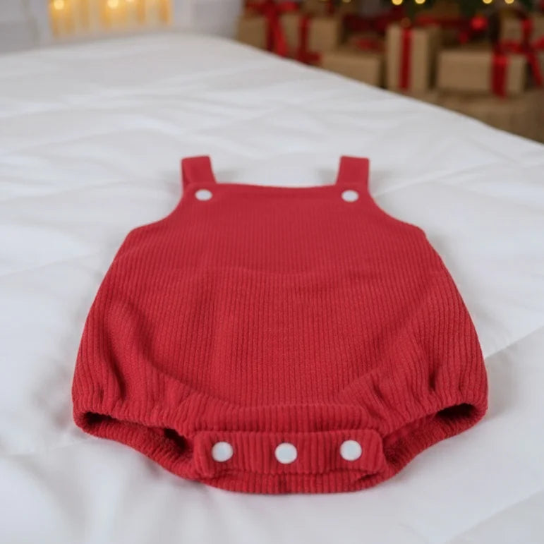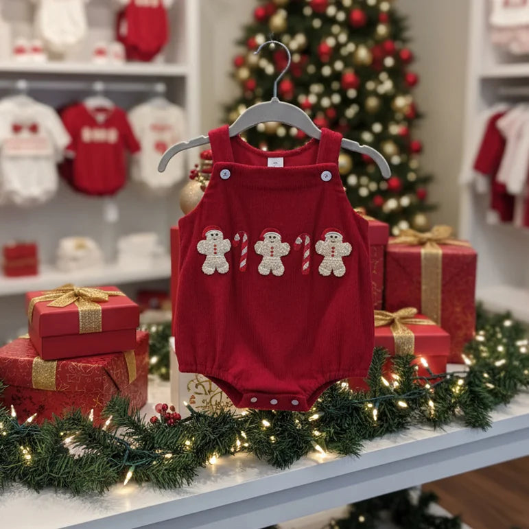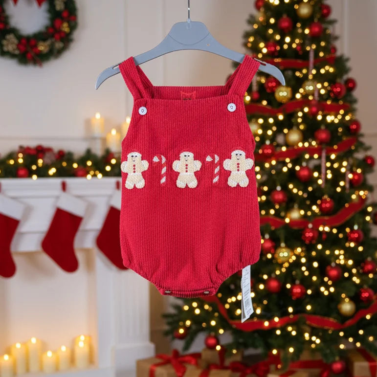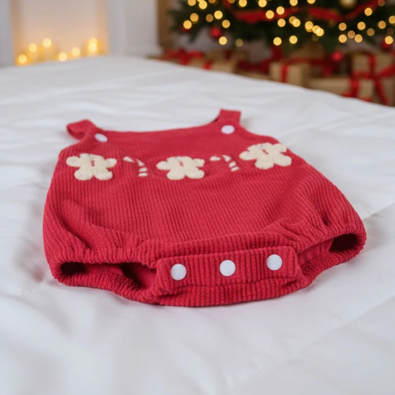This cheerful red romper is sprinkled with festive joy, featuring adorable gingerbread friends and candy canes that bring the warmth of holiday baking right into your baby’s wardrobe. Crafted from soft, breathable knit fabric, it keeps your little one snug through every giggle, cuddle, and Christmas nap.