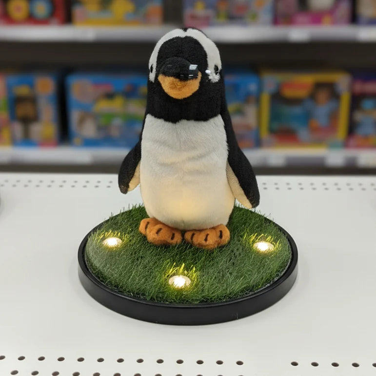 Introducing Arctic Buddy, the charming plush penguin displayed in his own miniature habitat! This delightful toy features classic black and white coloring with a friendly face and little orange feet. Measuring 13cm in length and 21cm in height, the penguin is nestled on a stylish black base surrounded by artificial grass and illuminated by soft, integrated LED lights. It’s a captivating piece that brings a touch of polar wonder to any room. ✨💡