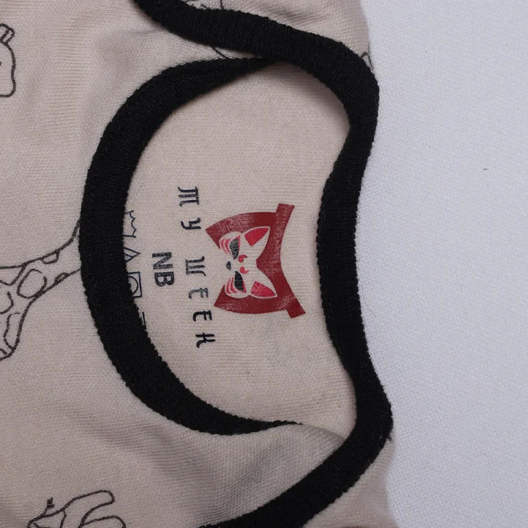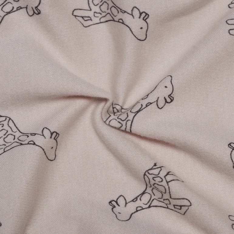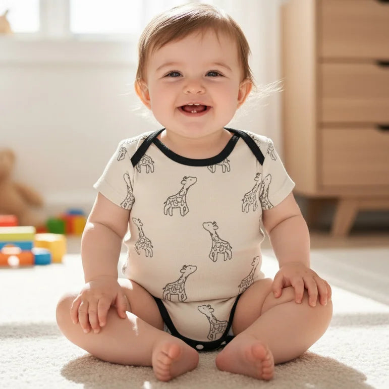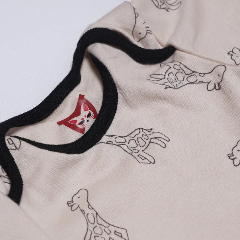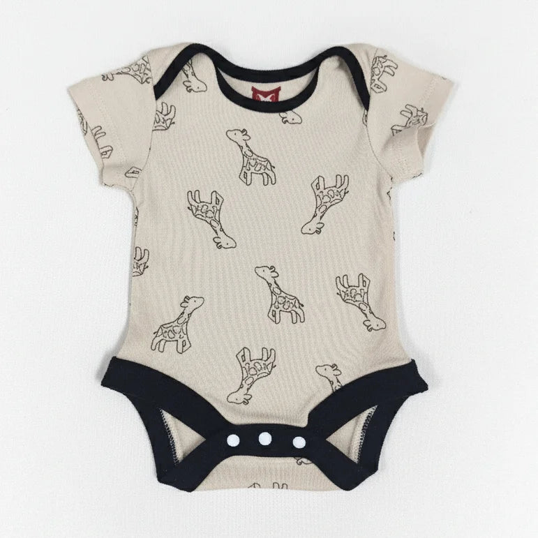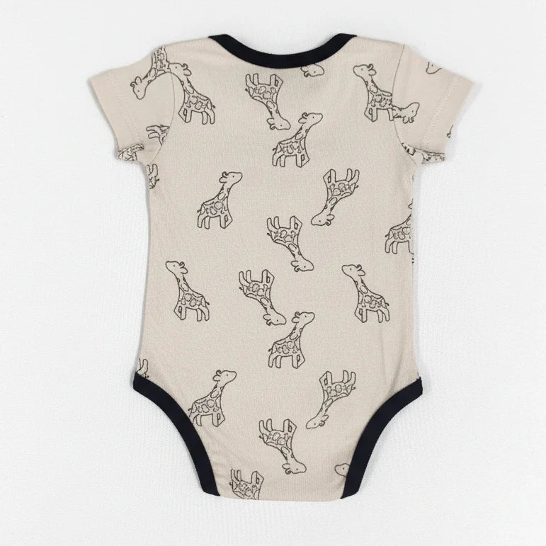 Introduce a touch of safari charm to your baby's wardrobe with the sweet Fawn & Fern Onesie. This short-sleeve bodysuit features a soft, gentle fawn/beige base color, adorned with a delicate, repeating pattern of outlined giraffes, giving it a playful yet sophisticated jungle theme. The design is beautifully highlighted by a bold, contrasting black trim around the envelope neckline, arm openings, and the unique cross-over detail at the leg openings. This bodysuit includes convenient snap closures at the bottom for quick and easy diaper changes. Made from a comfortable, breathable fabric, the Fawn & Fern Onesie is an ideal, stylish piece for layering or wearing alone during warm weather.