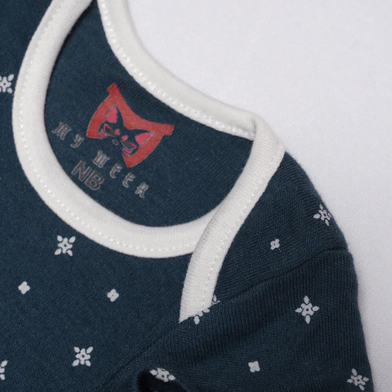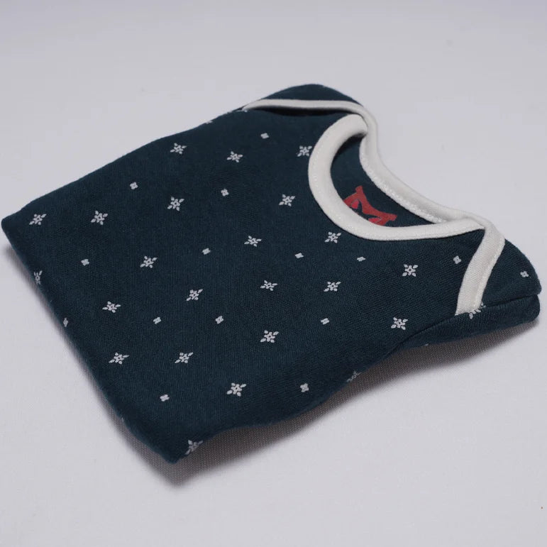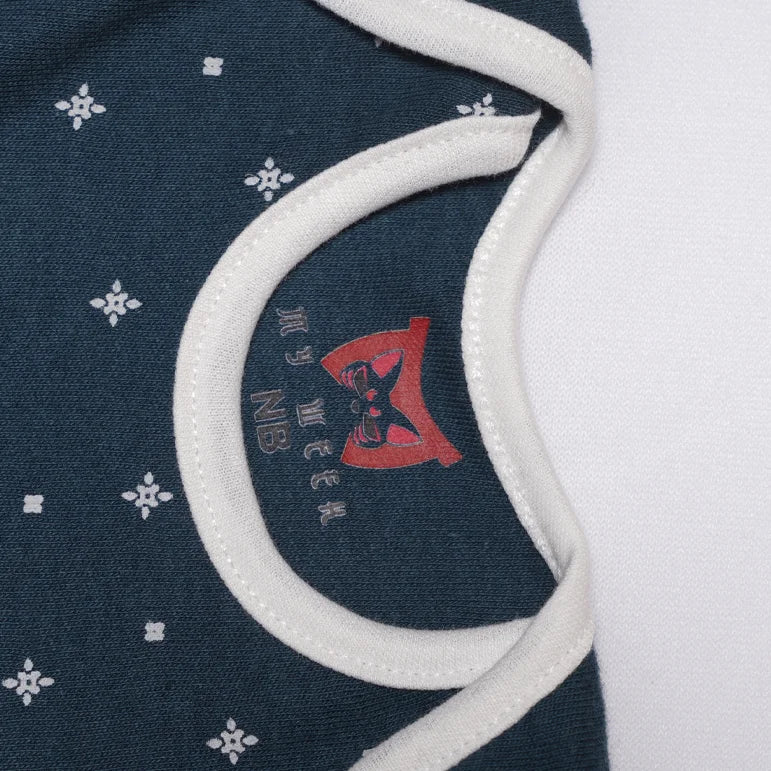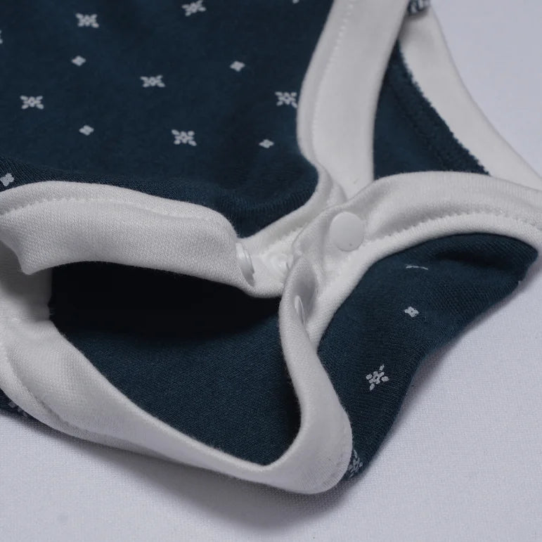 Drift off to sweet dreams in the enchanting Milky Way Onesie. This sophisticated short-sleeve bodysuit features a deep, rich navy or dark blue background reminiscent of the night sky, speckled with a delicate, repeating pattern of small white star-like or diamond shapes. The dark base color is beautifully contrasted by a clean, crisp white trim around the envelope neckline (lap shoulder), arm openings, and leg openings, giving the bodysuit a polished, modern finish. Designed for maximum convenience, it includes secure snap closures at the bottom for quick and easy diaper changes. Made from soft, breathable fabric, the Milky Way Onesie is the perfect cozy base layer for cooler nights or a stylish stand-alone outfit for daytime celestial adventures.