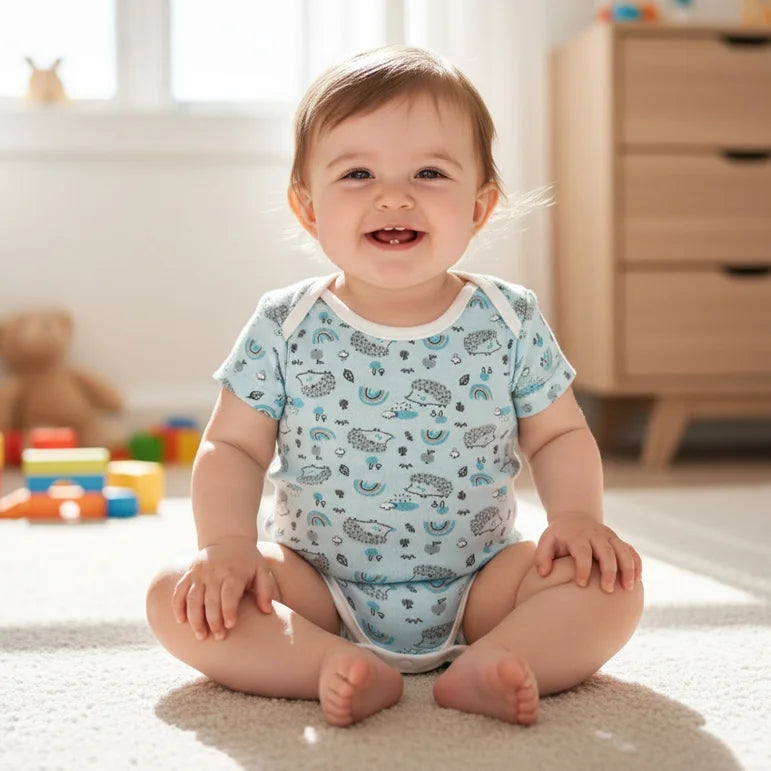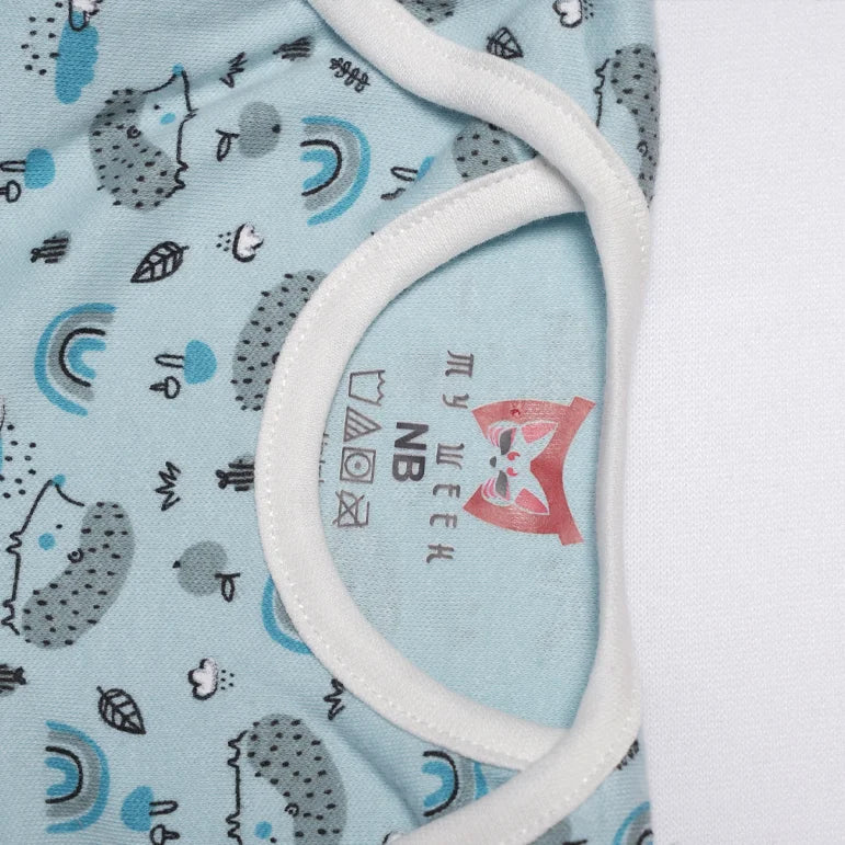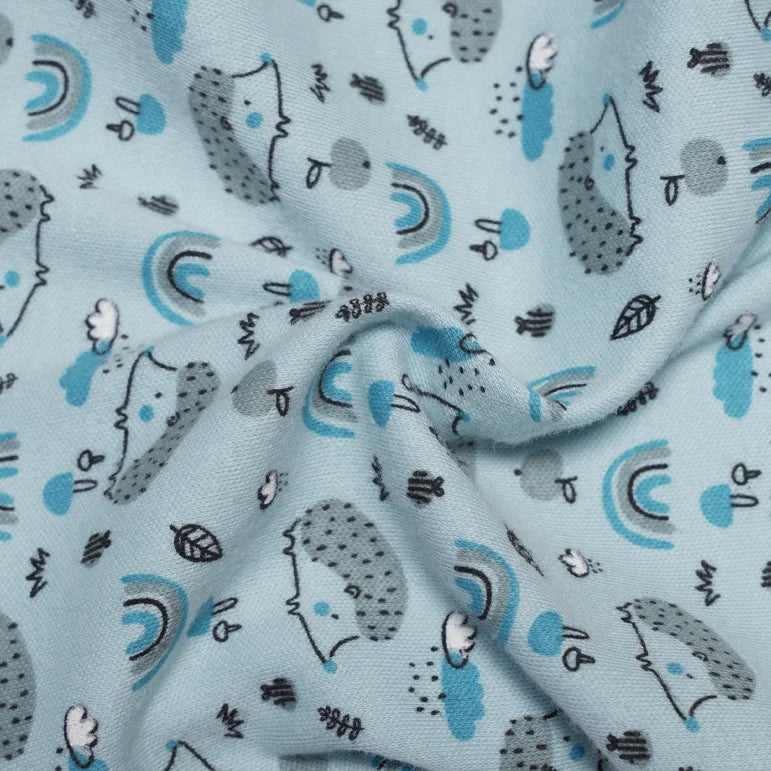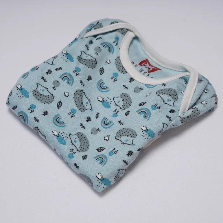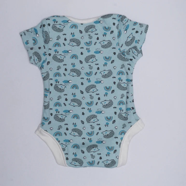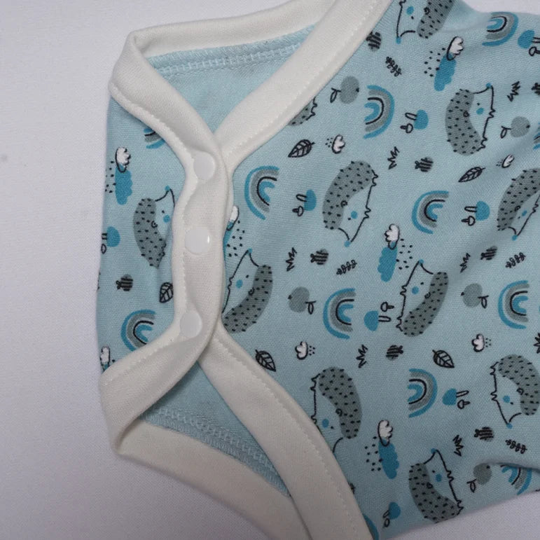 Snuggle up your little one in the utterly charming Hedgehog Onesie! This short-sleeve bodysuit features a serene light blue background adorned with an enchanting, playful pattern of adorable grey hedgehogs, cheerful rainbows, and fluffy little clouds. The whimsical print brings a touch of woodland magic to everyday wear. Designed for both comfort and convenience, it boasts a classic envelope neckline (lap shoulder) and sturdy snap closures at the bottom, making dressing and diaper changes wonderfully quick and fuss-free. A clean, contrasting white trim beautifully frames the neckline, arm, and leg openings, adding a crisp finish. Crafted from soft, breathable fabric, this onesie is perfect as a cozy base layer or a delightful standalone outfit.