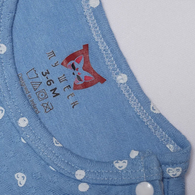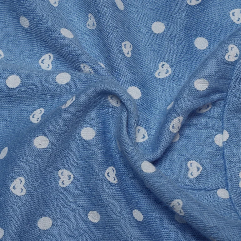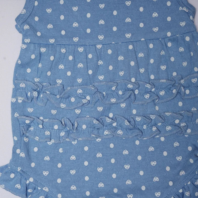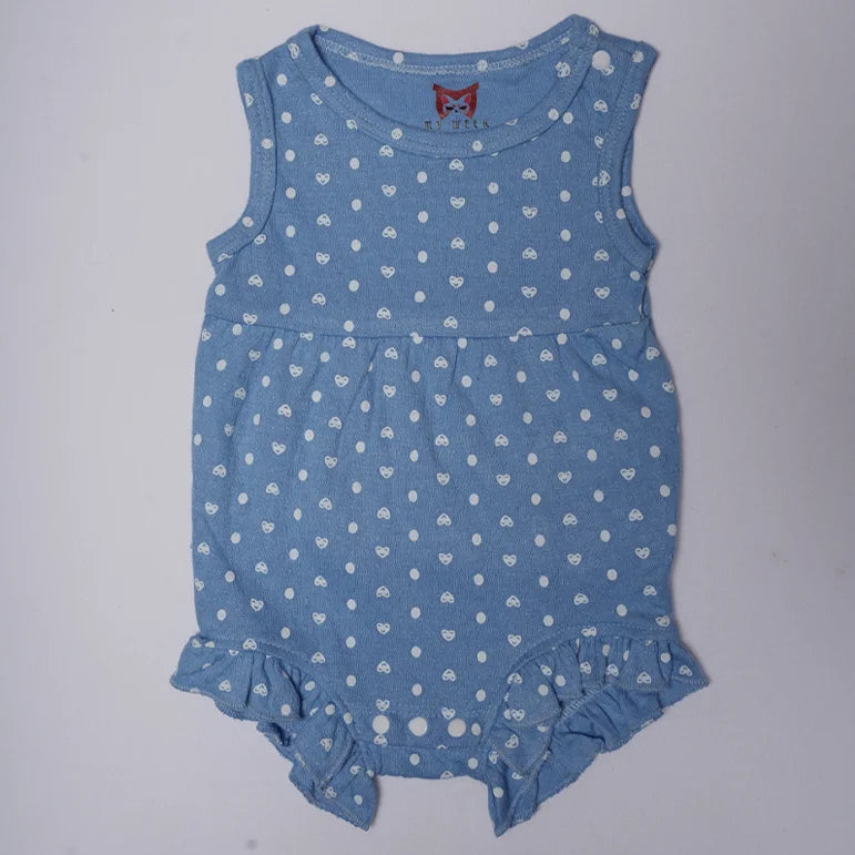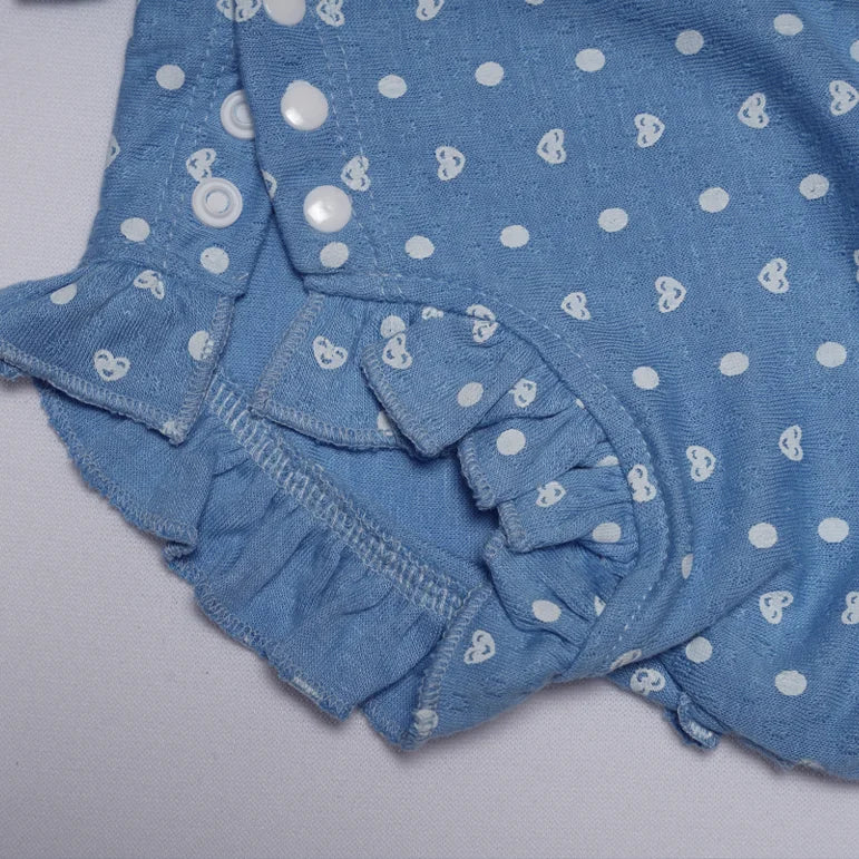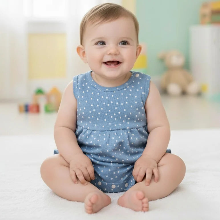 Introduce a sunny dose of charm to your baby's summer wardrobe with the delightful Cobalt Romper. This sleeveless creeper features a bright, beautiful light blue (cobalt-like) base color, overlaid with a sweet, all-over pattern of white polka dots that adds a classic, cheerful feel. Designed for ultimate ease, the romper includes convenient snaps at the shoulder and the bottom for quick and fuss-free dressing and diaper changes. The key enchanting feature is the delicate, playful ruffle trim along the leg openings, which adds a flirty, feminine touch. Crafted from a soft, breathable knit fabric, the Cobalt Romper is perfect for keeping your little one cool, comfortable, and absolutely adorable on any warm-weather outing.