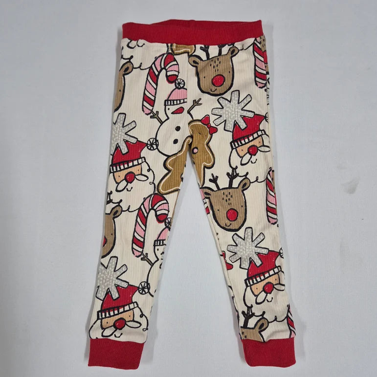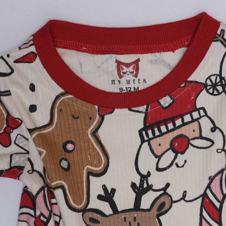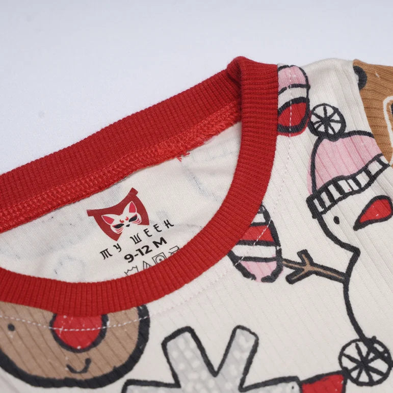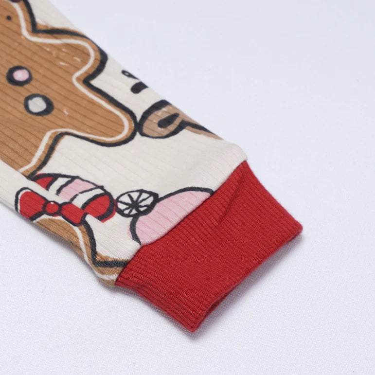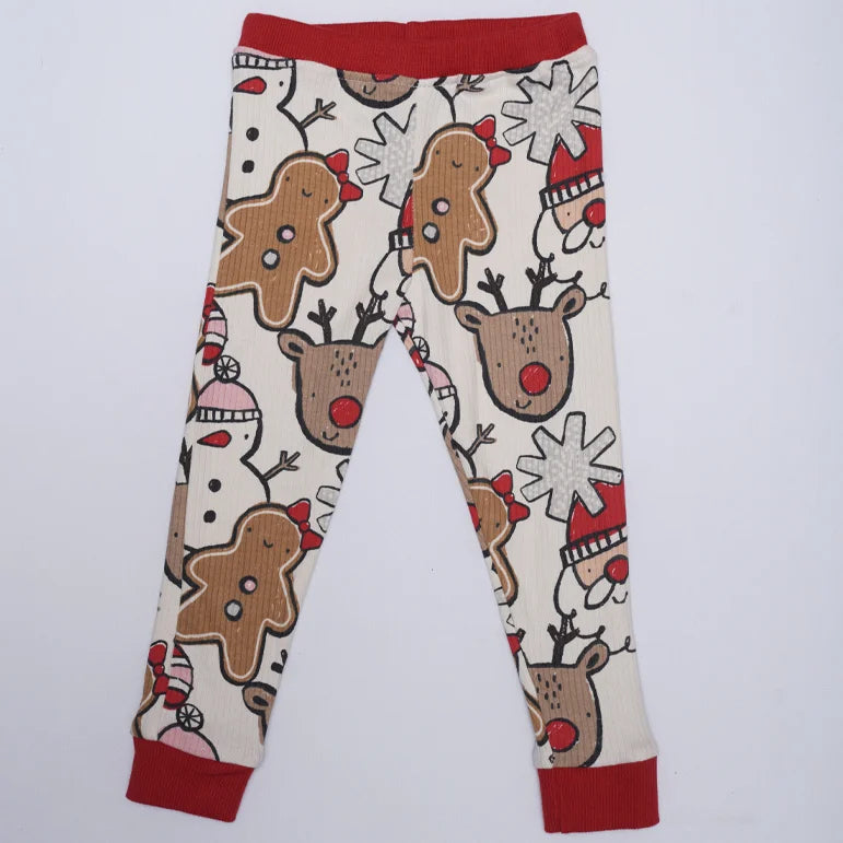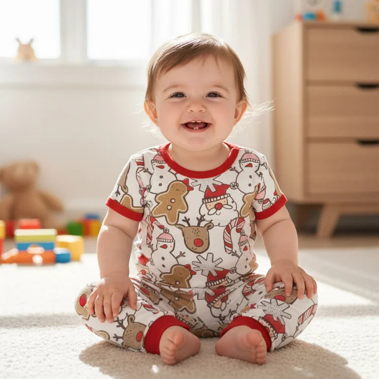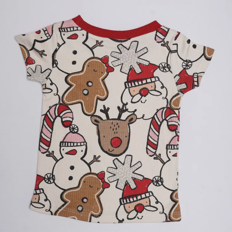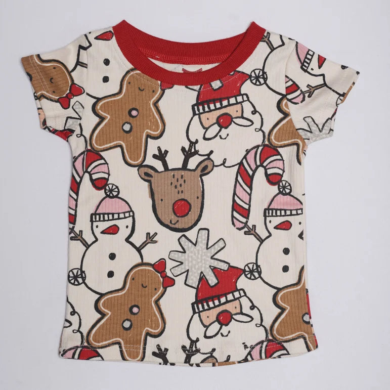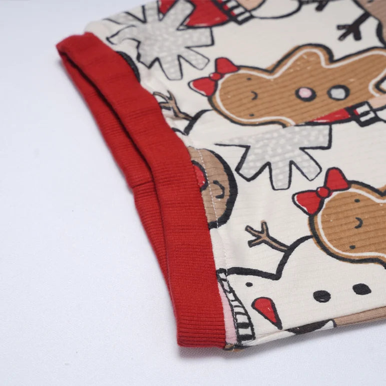 Get ready for the holidays with the adorable December bell Christmas PJ Set Short Sleeve! This charming two-piece set features a classic short-sleeve top and matching full-length leggings, perfect for snuggling up during the festive season. The cream-colored fabric is covered in a delightful holiday pattern featuring whimsical snowmen, cheerful reindeer, smiling gingerbread men, and festive candy canes. The playful print is framed by a rich, vibrant red trim on the neckline, cuffs, and waistband, which adds a beautiful pop of traditional Christmas color. Made from a soft, comfortable material, this set is ideal for Christmas morning photos, opening presents, or simply enjoying the cozy December atmosphere.