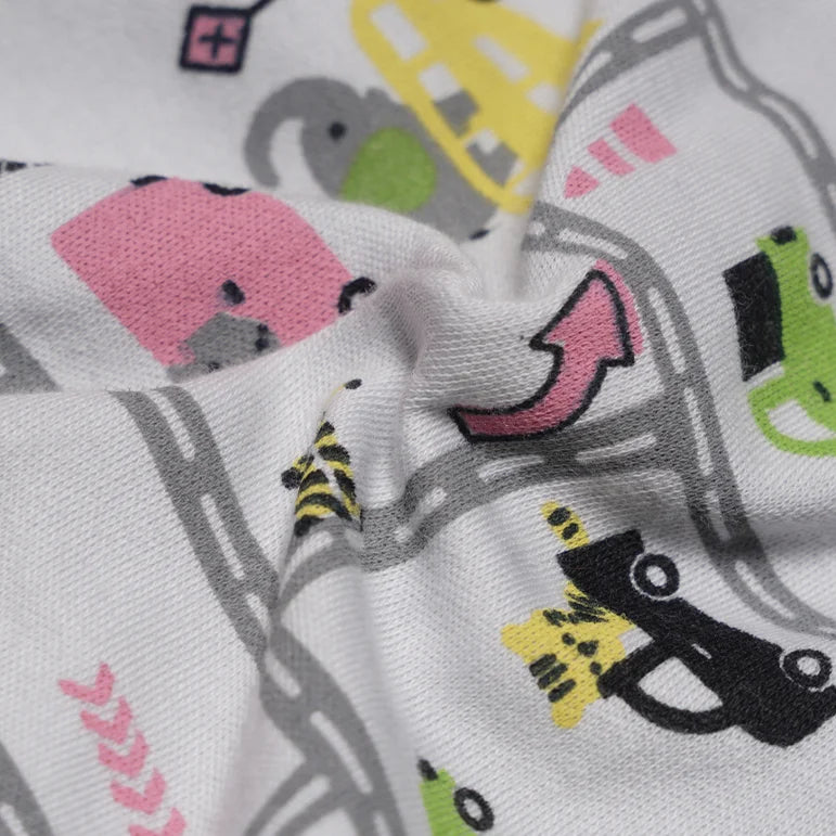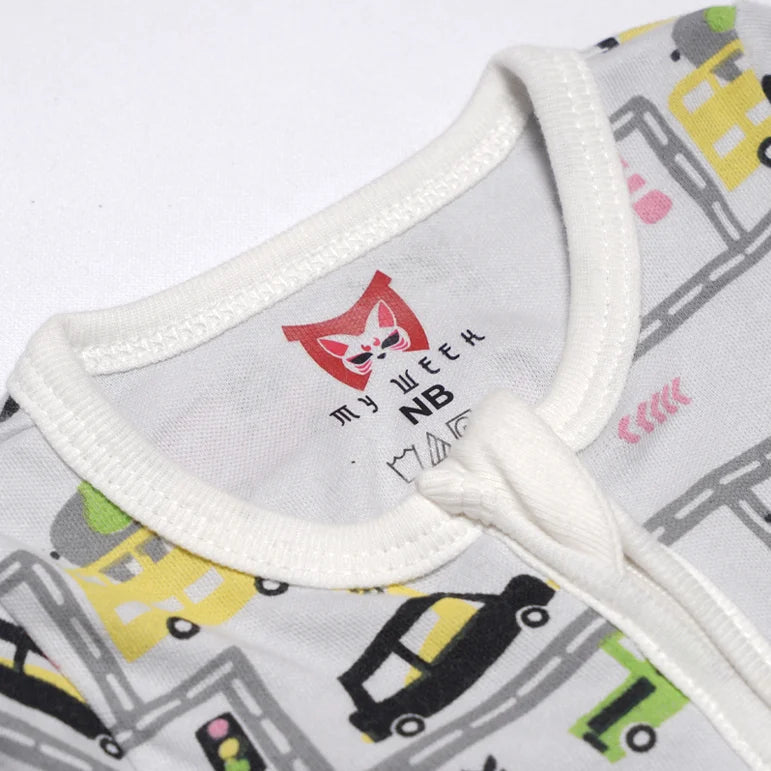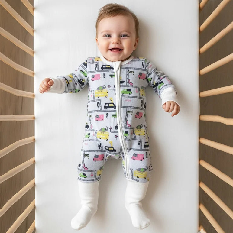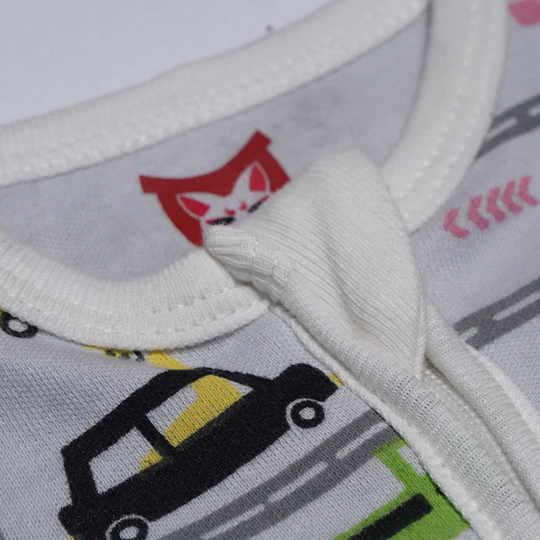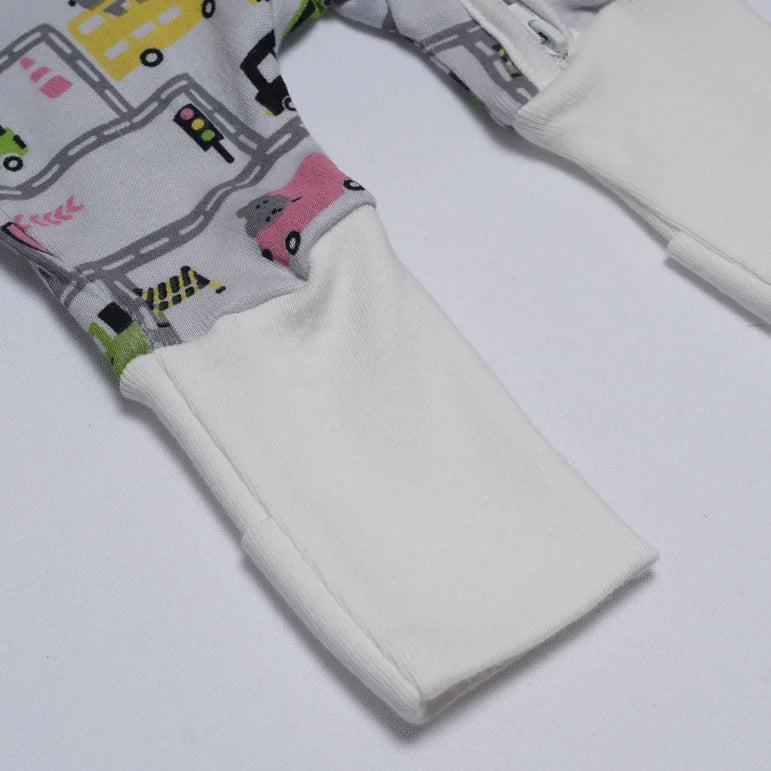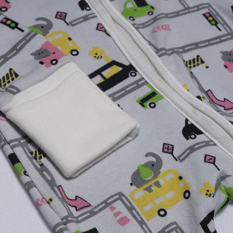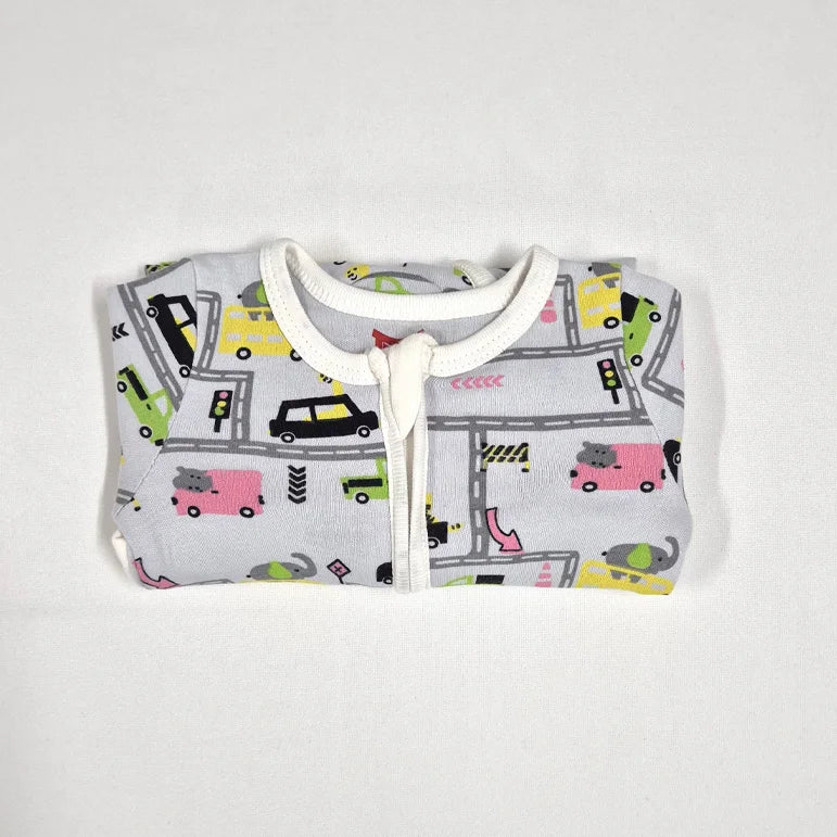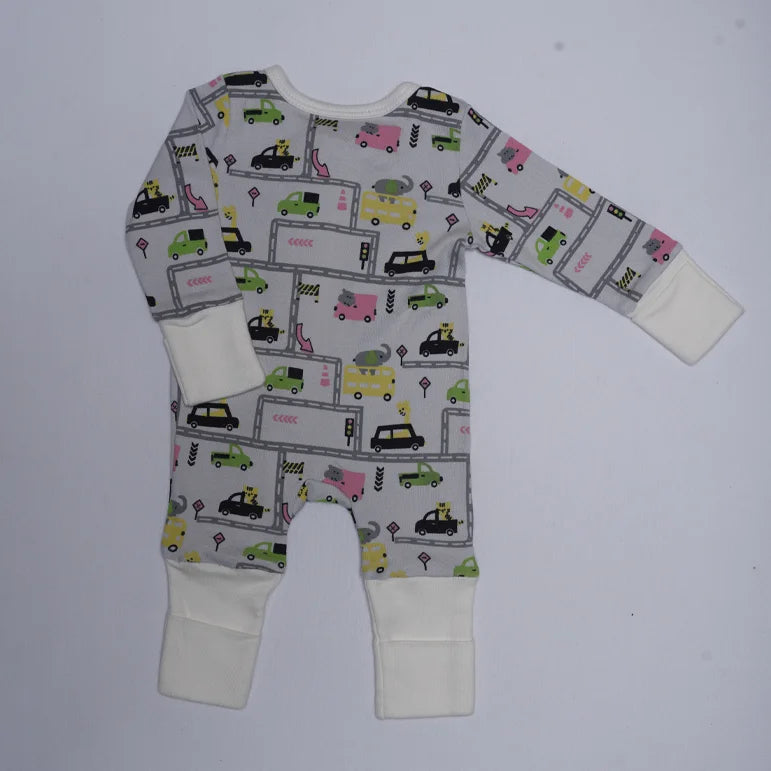 Let your little one roll in comfort with the engaging Road Rover Zippy, a stylish and practical full-length romper. This one-piece outfit features a fun, light gray print showcasing colorful cartoon cars and trucks navigating little roads and traffic lights, making it an instant favorite for little adventurers. Designed for maximum convenience, it includes a smooth, full-length front zipper that allows for incredibly quick and easy changes, running from the neck down to the ankle. Complementing the vibrant print, the wrists and ankles are finished with wide, cozy white cuffs. These cuffs can be comfortably folded to adjust the length, providing a flexible fit that grows with your baby and ensures long-lasting wear.