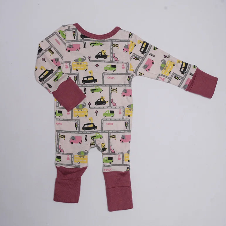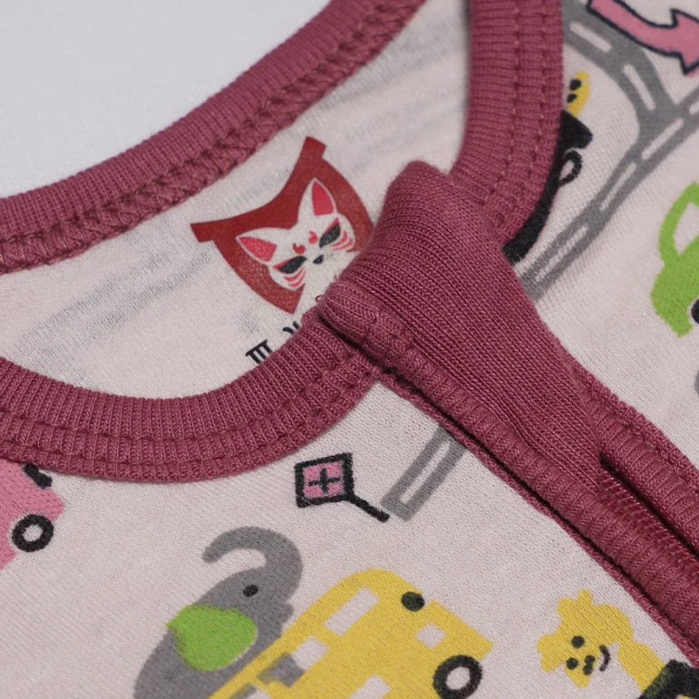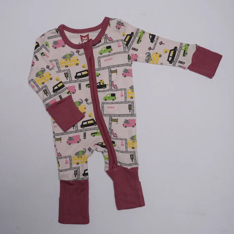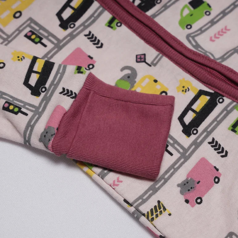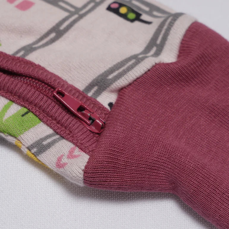 Get ready for an adventure with the charming City Wheels Zippy, a cozy and convenient one-piece outfit perfect for your little urban explorer. This full-length romper features a soft, pale pink background covered in an engaging print of colorful cartoon cars, trucks, and traffic lights, navigating busy city streets. Designed with both style and practicality in mind, the romper boasts a smooth, full-length front zipper running from neck to ankle, making diaper changes and quick dressing effortless. The neckline, zipper trim, and especially the wide wrist and ankle cuffs are finished in a rich, complementary berry-red knit. These substantial cuffs provide extra warmth and can be folded to ensure a flexible, growing fit for prolonged use.