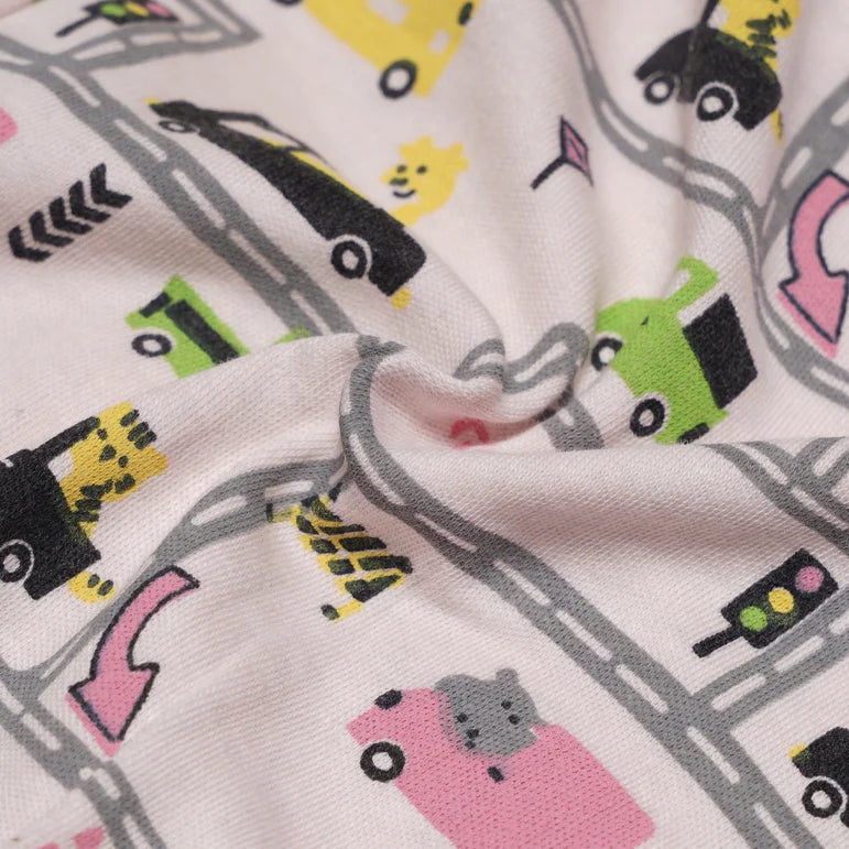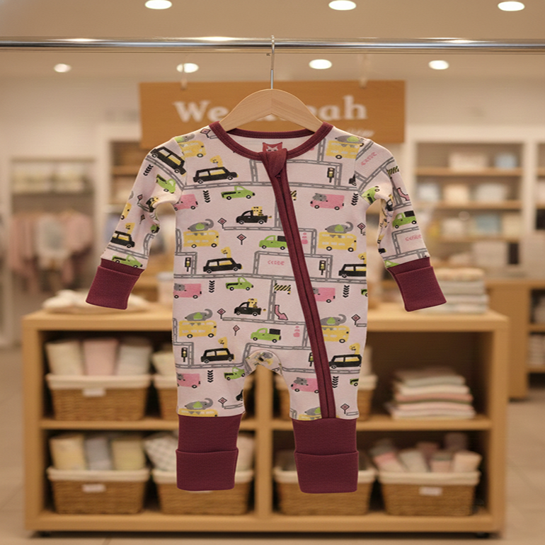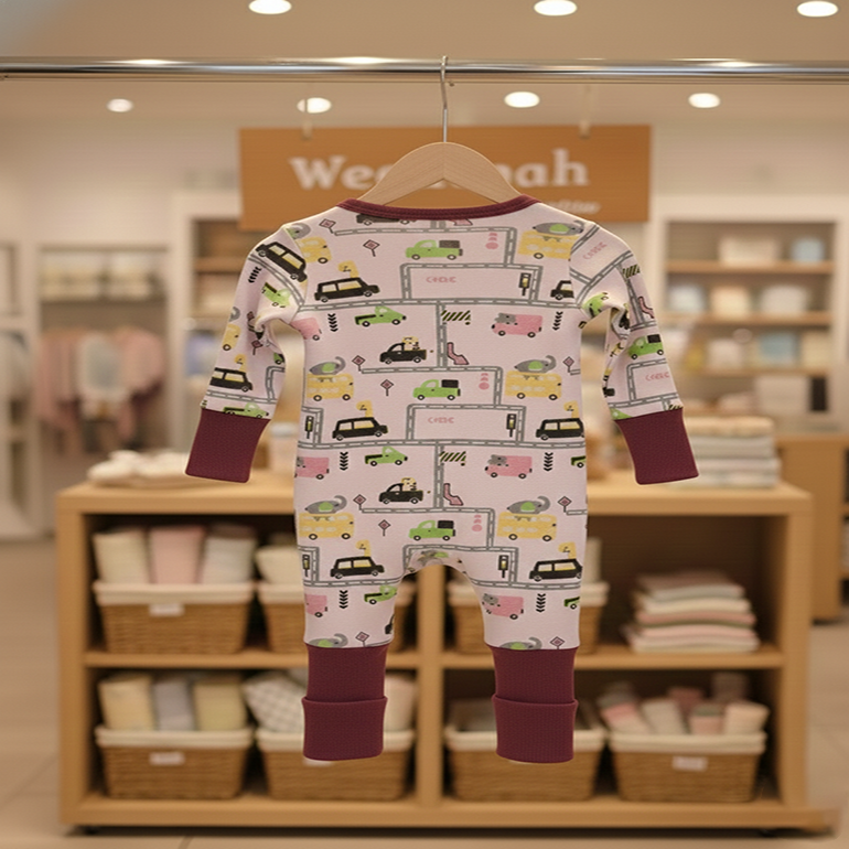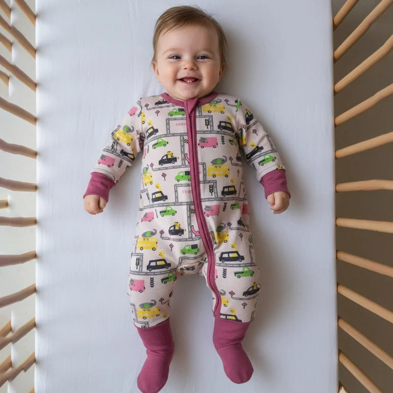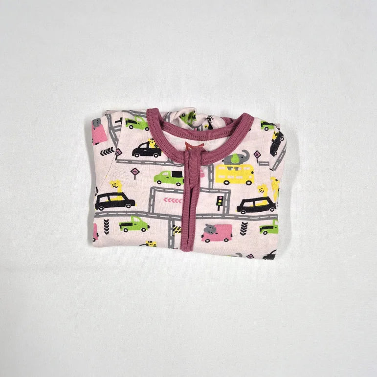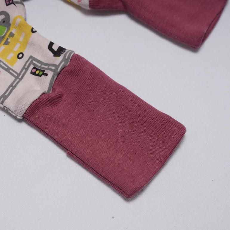 Get ready for an adventure with the charming City Wheels Zippy, a cozy and convenient one-piece outfit perfect for your little urban explorer. This full-length romper features a soft, pale pink background covered in an engaging print of colorful cartoon cars, trucks, and traffic lights, navigating busy city streets. Designed with both style and practicality in mind, the romper boasts a smooth, full-length front zipper running from neck to ankle, making diaper changes and quick dressing effortless. The neckline, zipper trim, and especially the wide wrist and ankle cuffs are finished in a rich, complementary berry-red knit. These substantial cuffs provide extra warmth and can be folded to ensure a flexible, growing fit for prolonged use.