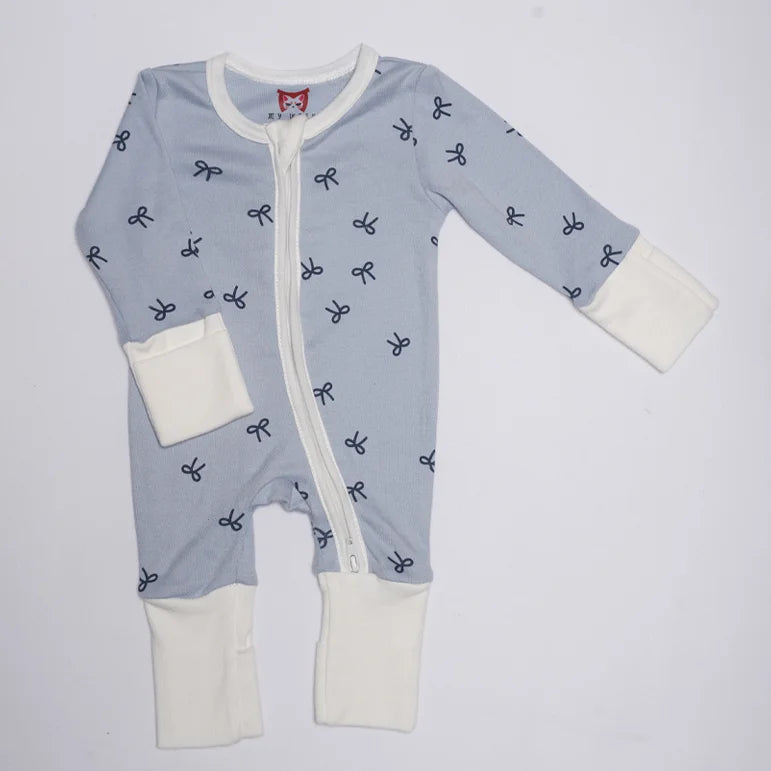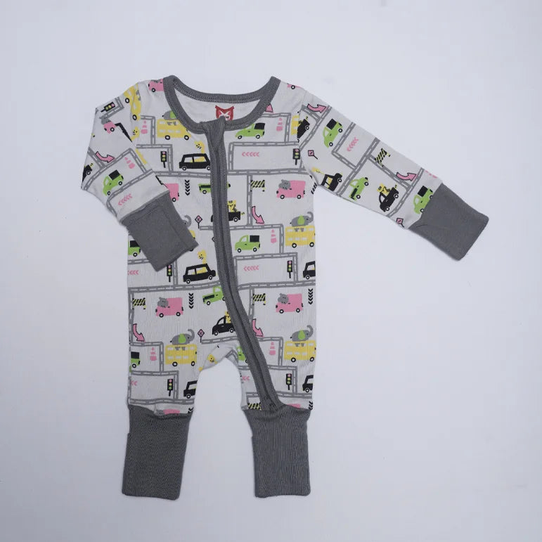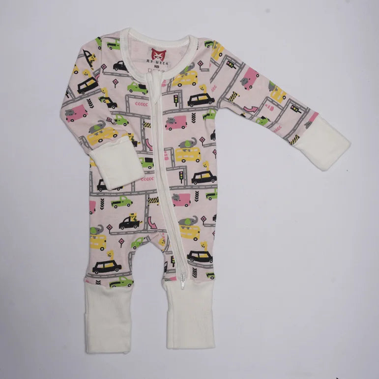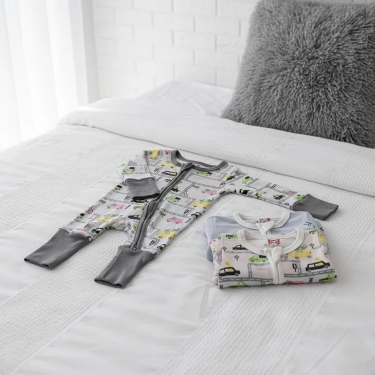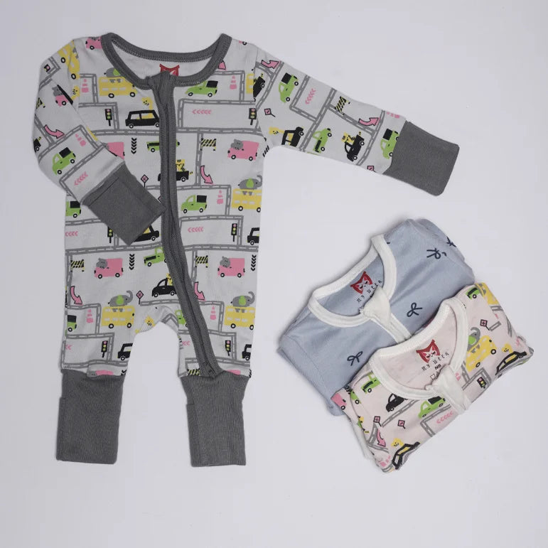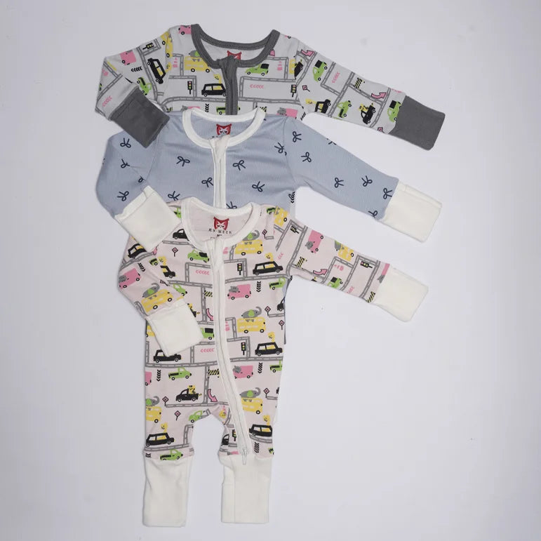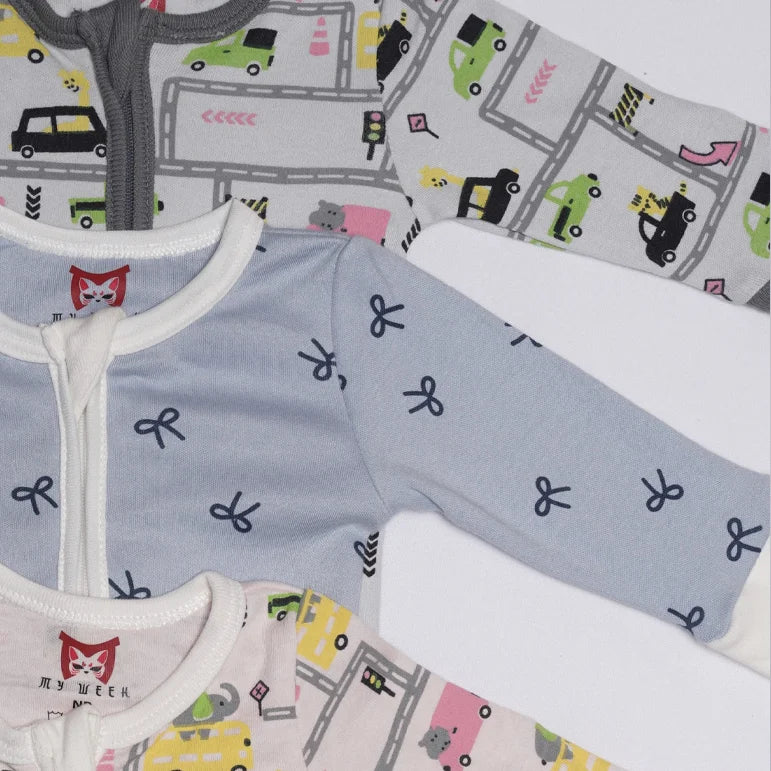 Embark on everyday adventures with the essential Little Traveler Zippy Set, a convenient trio of full-sleeve, one-piece rompers designed for comfort and ease. This set offers three adorable prints, each featuring a full-length, smooth front zipper for effortless changes, running from the neck to the ankle. The styles include a charming pale blue zippy with a delicate navy bow pattern, accented with crisp white cuffs; a light gray zippy featuring colorful cartoon cars and roads, framed by cozy dark gray/charcoal cuffs; and a pale pink zippy with the same fun city car pattern, finished with clean white cuffs. Crafted from soft, breathable fabric, these zippies also feature wide, foldable cuffs at the wrists and ankles, ensuring a flexible, extended fit that accommodates your baby's growth and travel adventures.