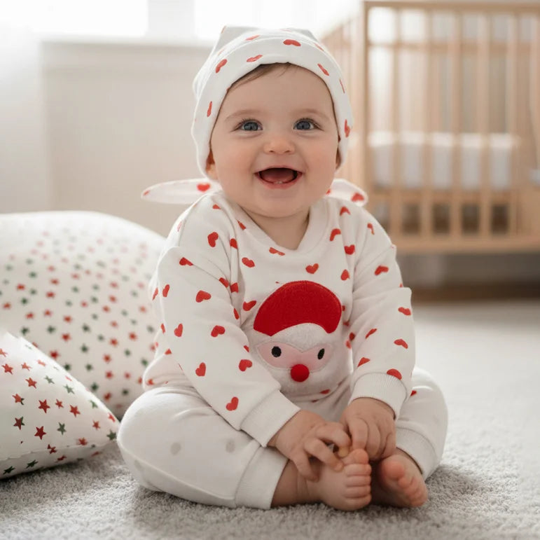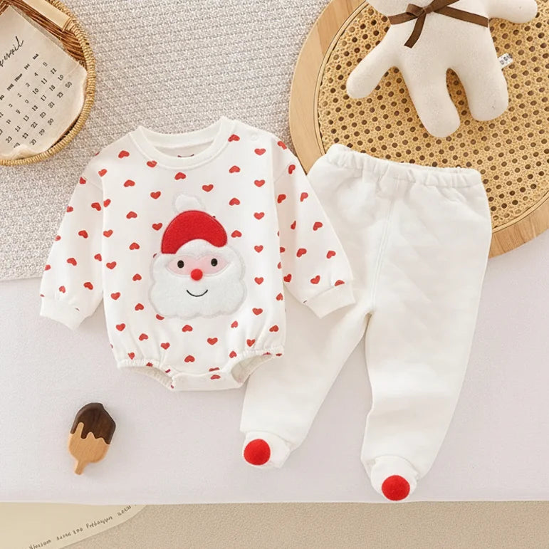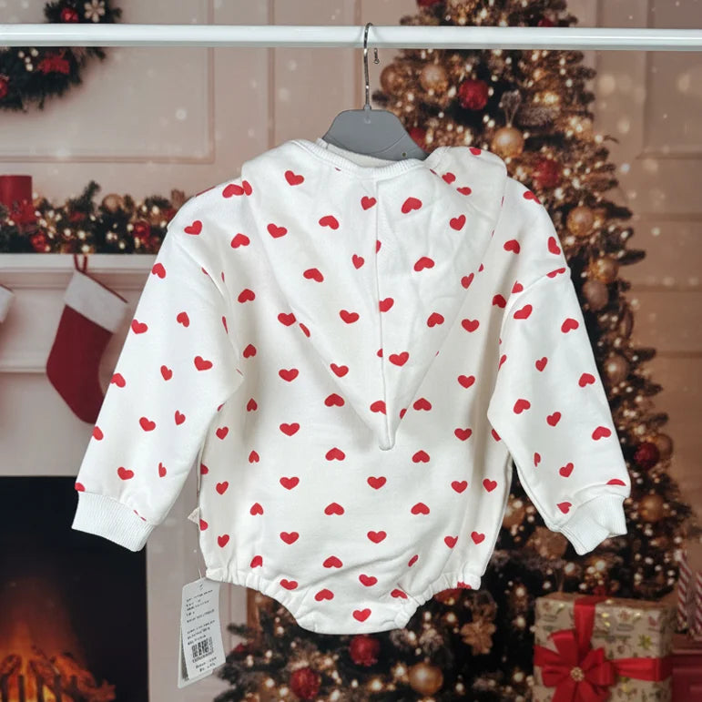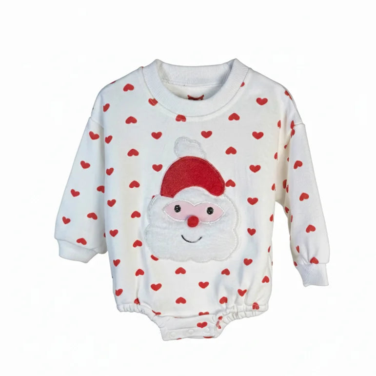 This adorable two-piece outfit features a soft, quilted white pant and a long-sleeve romper sprinkled with red hearts — complete with a fluffy Santa face that adds a touch of festive magic! Designed for warmth, comfort, and endless cuddles, it’s perfect for holiday mornings, playtime fun, or cozy family photos.