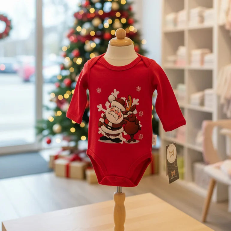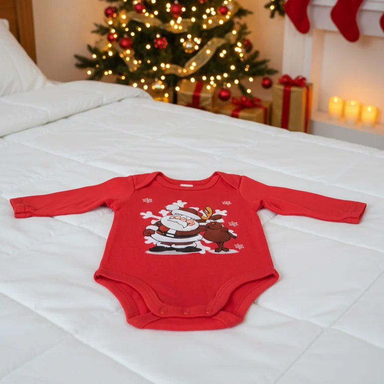 Made for merry moments and cozy hugs, this bright red onesie features Santa and his reindeer buddy sharing a joyful holiday moment — perfect for your little one’s first Christmas memories. Crafted from soft, breathable cotton, it keeps your baby comfy through every giggle, nap, and festive photo.