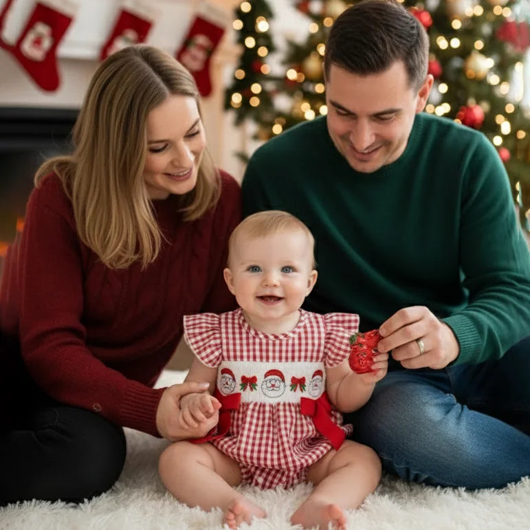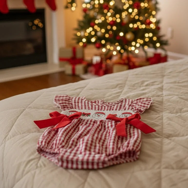 This adorable red-and-white gingham romper captures the heart of the holidays with beautifully hand-smocked Santa faces and festive green bows across the chest. Designed for little ones who love to giggle, wriggle, and sparkle, it’s the perfect outfit for Christmas photos, family gatherings, and cozy fireside cuddles.