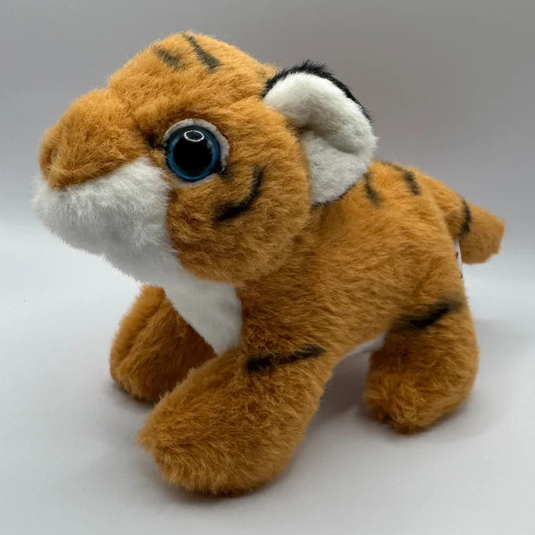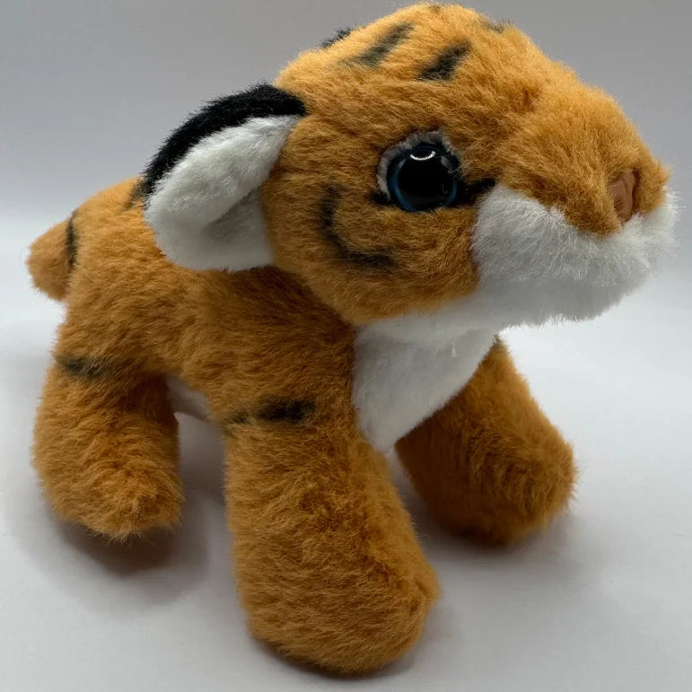 Say hello to Baby Stripe , the tiny tiger cub ready for big adventures! This little friend is wonderfully detailed, featuring the classic orange fur and black stripes of a jungle cat, complete with bright white accents and adorable sparkly blue eyes . Despite their small size, Baby Stripe is packed with charm and softness, made from gentle 100% polyester material and responsibly filled with comforting recycled fiber . This makes them the ideal companion to tuck into a backpack, take on road trips, or hold onto for comforting snuggles. Baby Stripe is the perfect pint-sized plush pal for any animal lover!