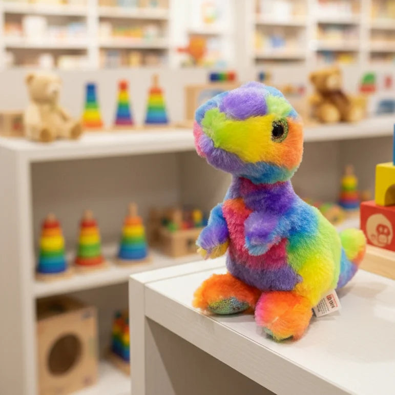 Roar into fun with Twinkle Raptor , the plush T-Rex that shines brighter than any star! This stunning dinosaur features vibrant, tie-dye inspired fur in a spectacular mix of rainbow colors including bright green, purple, blue, and pink. What truly sets Twinkle Raptor apart are the captivating, glittering eyes that sparkle with prehistoric charm! Made from super-soft 100% polyester material for the fuzziest texture, and conscientiously filled with recycled fiber , Twinkle Raptor is a cuddly and responsible companion. With their fun, fierce posture and soft, huggable body, this plush toy is perfect for inspiring colorful adventures and becoming the shining centerpiece of any toy collection.