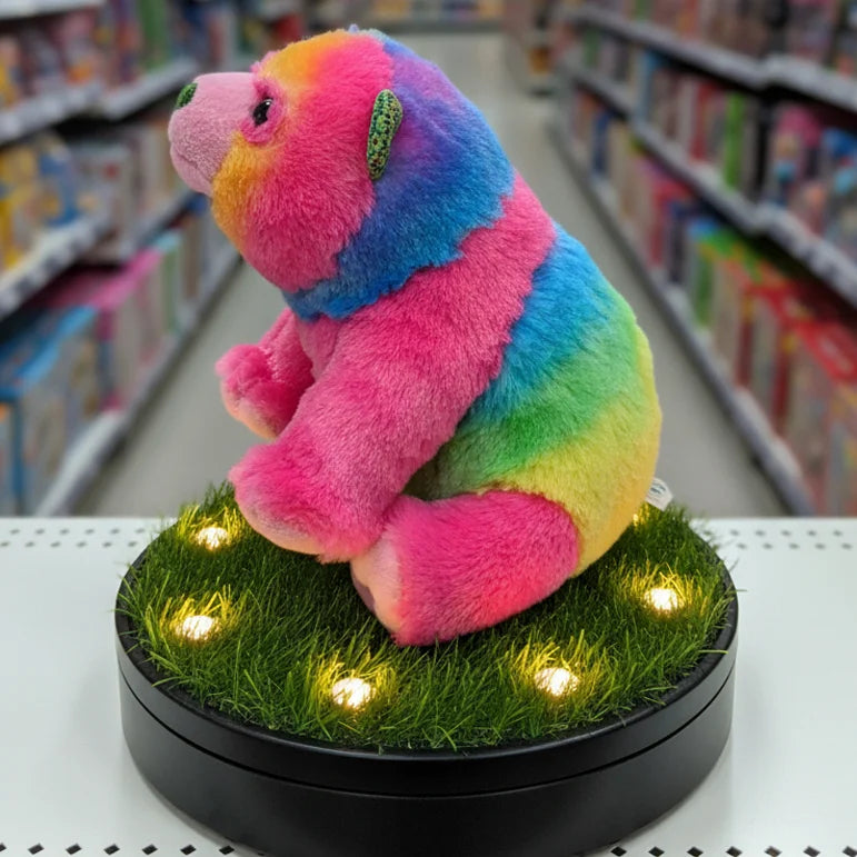 Meet Dreamy Teddy, the brilliantly colorful plush bear displayed on its own light-up base! This unique teddy stands out with its stunning rainbow-colored fur, featuring bright pinks, yellows, blues, and greens, and a sweet, embroidered face. Measuring 31cm in length and 18cm in height, the bear sits atop a stylish black stand covered in artificial grass and subtly illuminated by small LED lights. It’s an eye-catching display piece that adds a burst of joy and color to any setting. ✨💖